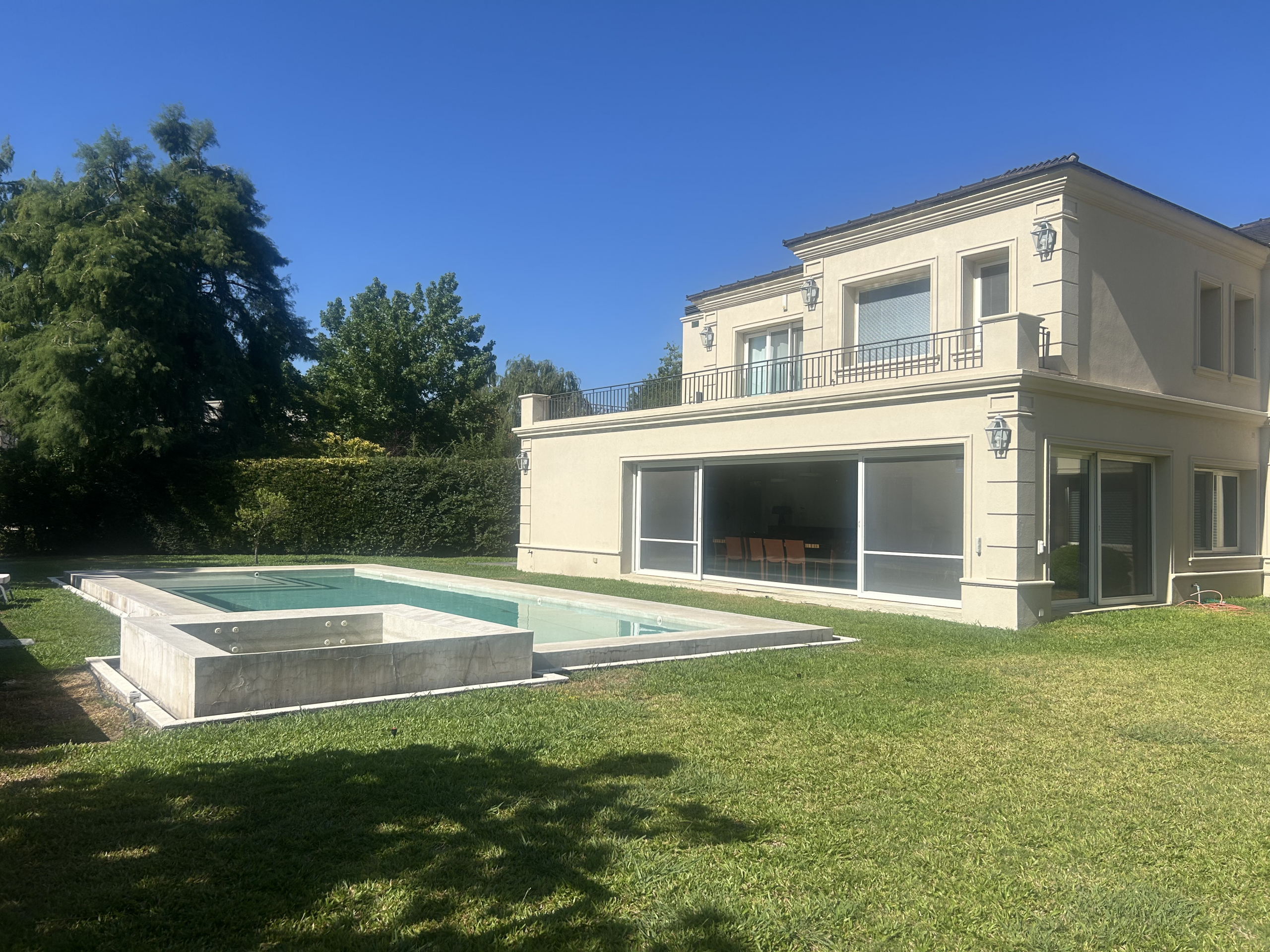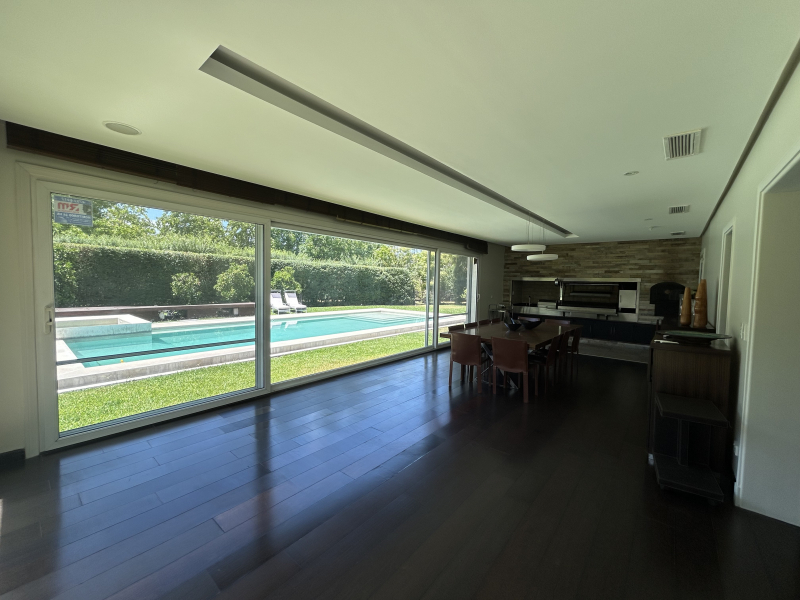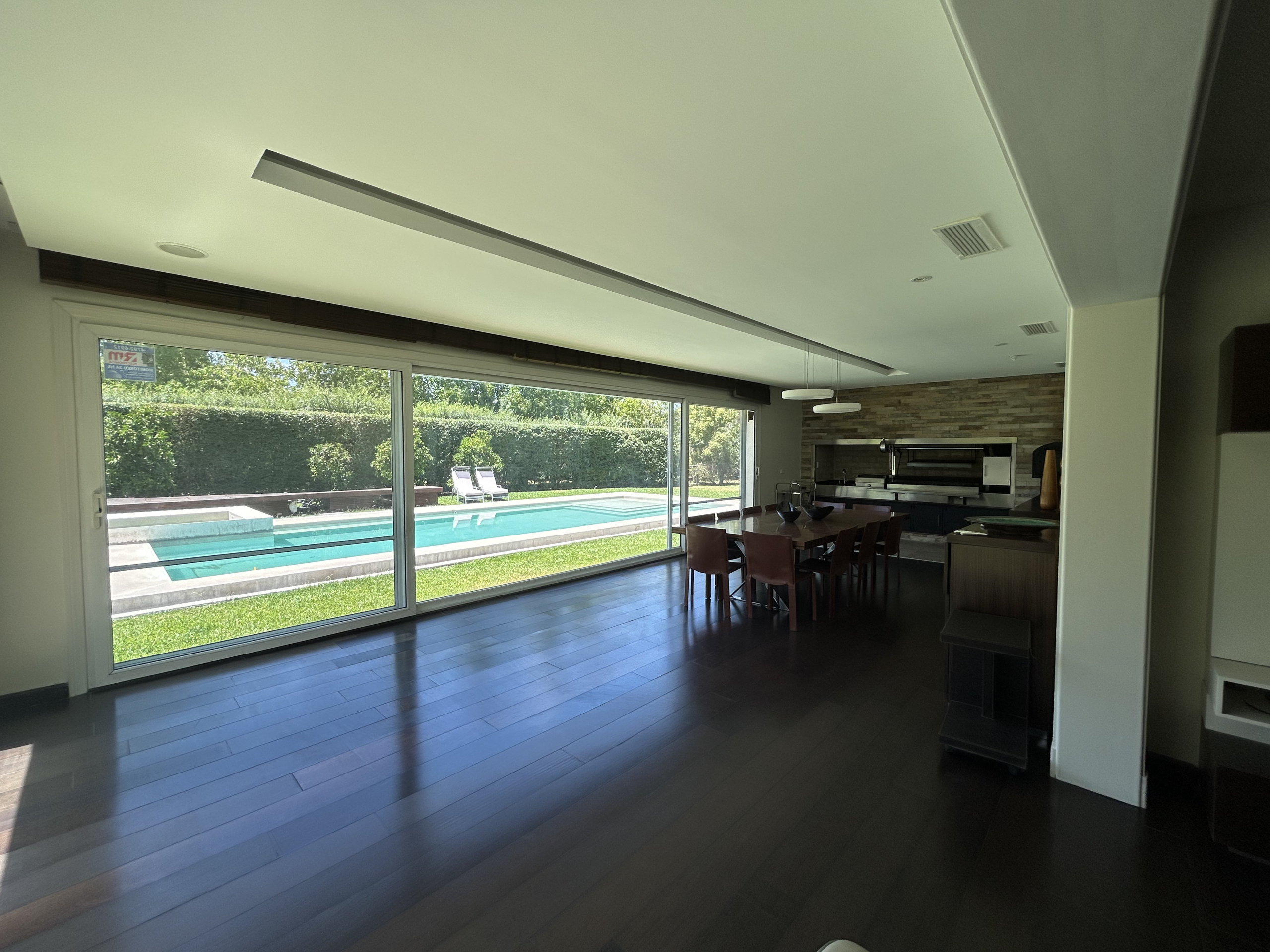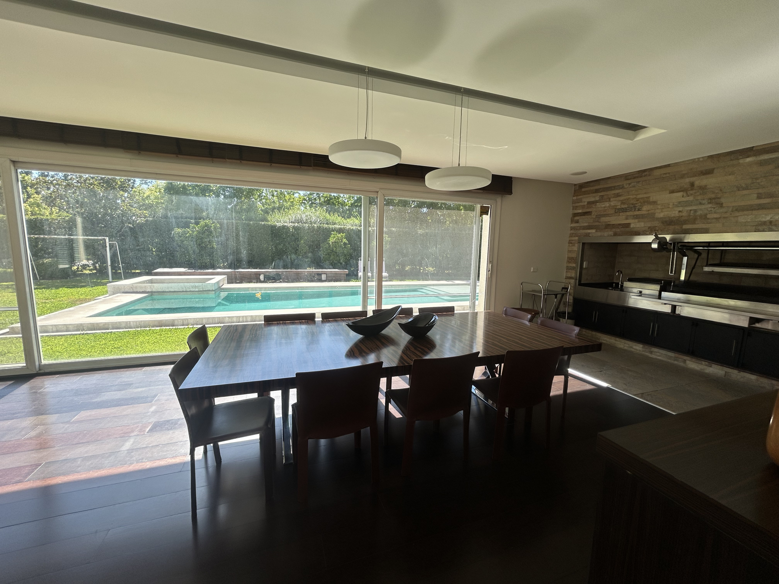 La propiedad se ubica en un privado cul de sac, desde donde se accede al aparcamiento para 2 coches cubierto, al ingresar a la casa tenemos un amplio recibidor desde donde se puede acceder al aseo, a la fantástica cocina y a su living comedor de grandes dimensiones y varios ambientes que se conectan con la galería, jardín, espectacular quincho cubierto y pileta climatizada con jacuzzi. La cocina esta completamente equipada con electrodomésticos Smeg y Samsung. Desde esta zona se accede al lavadero y 2 dormitorios con 1 baño completo que pueden ser útiles para huéspedes. El sector de family room y quincho cuenta con parrilla de acero inoxidable a leña, horno de barro y sector de parrilla a gas, un baño completo y fabulosa mesa para 14 personas, todo este sector con grandes ventanales y cortinas automatizadas de madera que conectan con el sector de la piscina de 7 x 14 mts. El jardín es maduro con riego automático y muy cuidado.