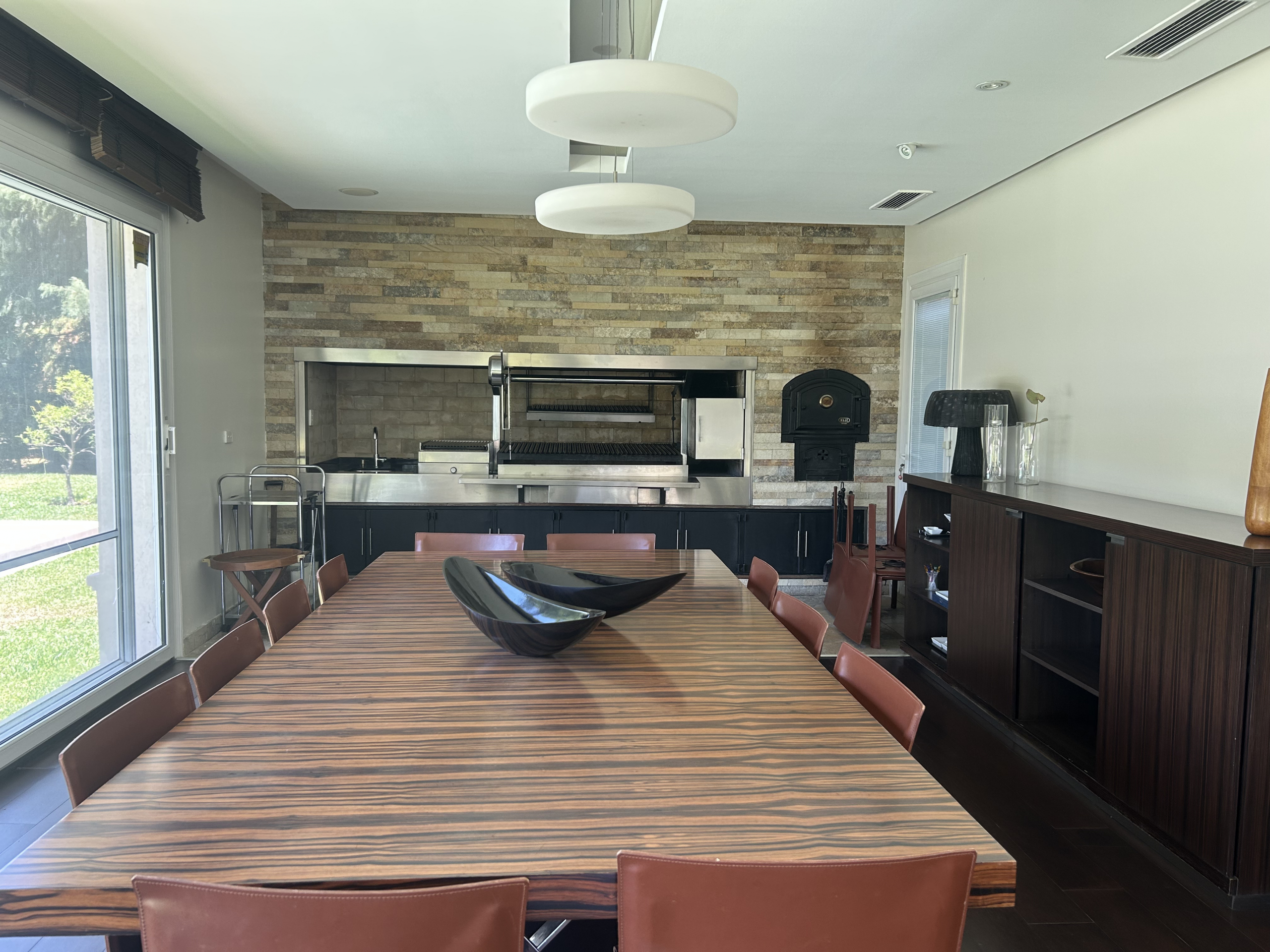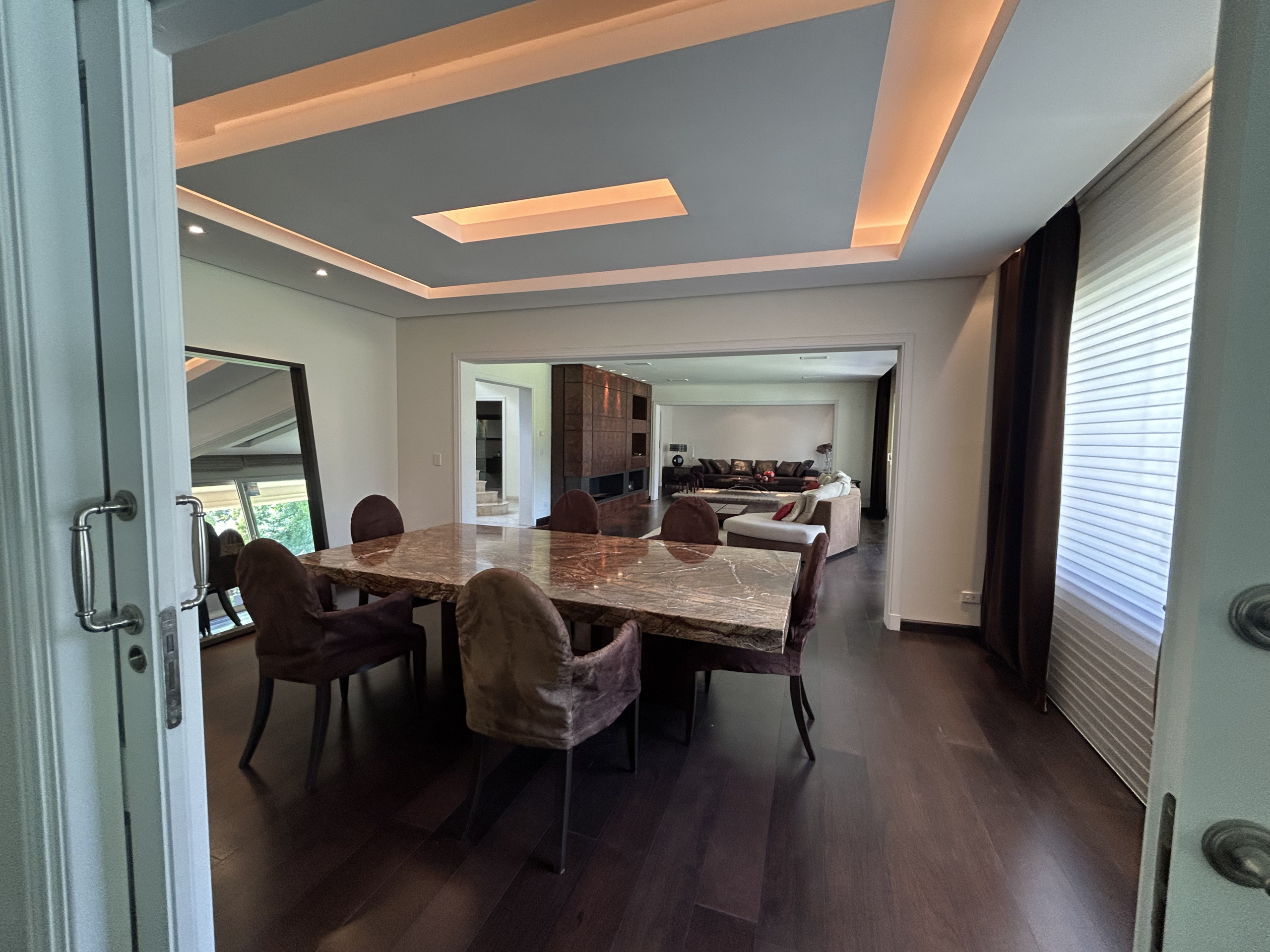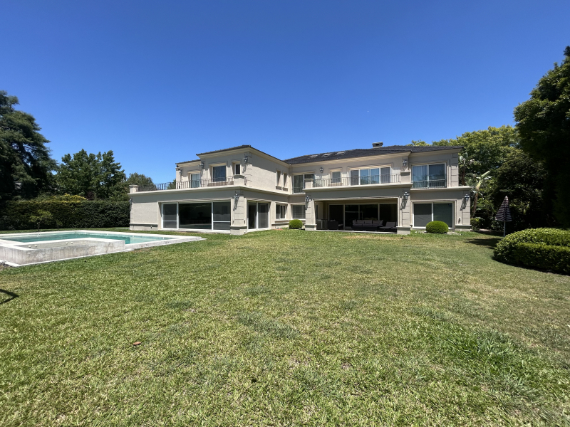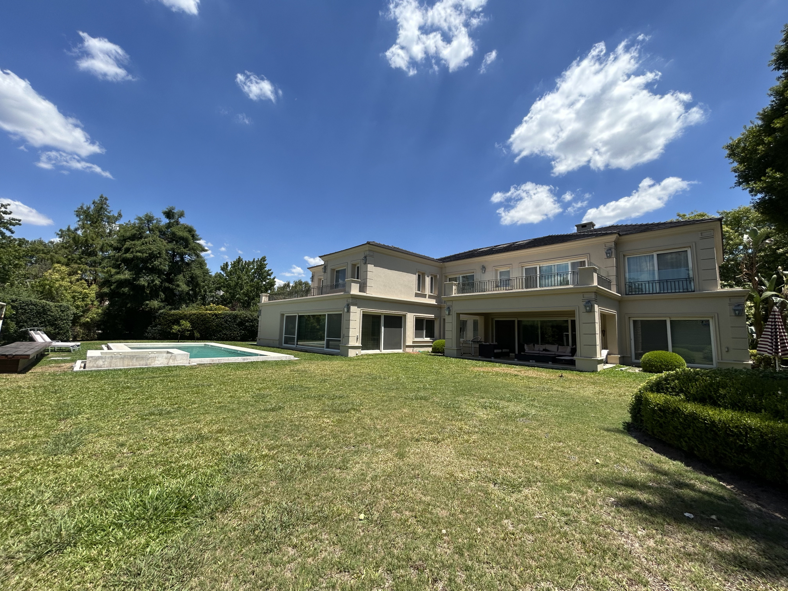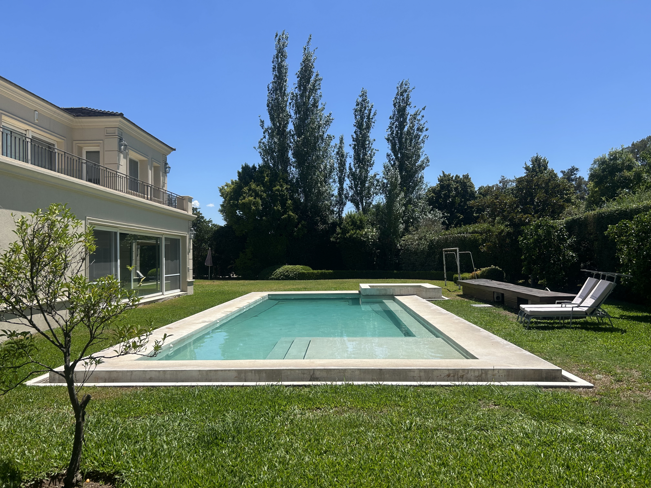 La propiedad se ubica en un privado cul de sac, desde donde se accede al aparcamiento para 2 coches cubierto, al ingresar a la casa tenemos un amplio recibidor desde donde se puede acceder al aseo, a la fantástica cocina y a su living comedor de grandes dimensiones y varios ambientes que se conectan con la galería, jardín, espectacular quincho cubierto y pileta climatizada con jacuzzi. La cocina esta completamente equipada con electrodomésticos Smeg y Samsung. Desde esta zona se accede al lavadero y 2 dormitorios con 1 baño completo que pueden ser útiles para huéspedes. El sector de family room y quincho cuenta con parrilla de acero inoxidable a leña, horno de barro y sector de parrilla a gas, un baño completo y fabulosa mesa para 14 personas, todo este sector con grandes ventanales y cortinas automatizadas de madera que conectan con el sector de la piscina de 7 x 14 mts. El jardín es maduro con riego automático y muy cuidado.