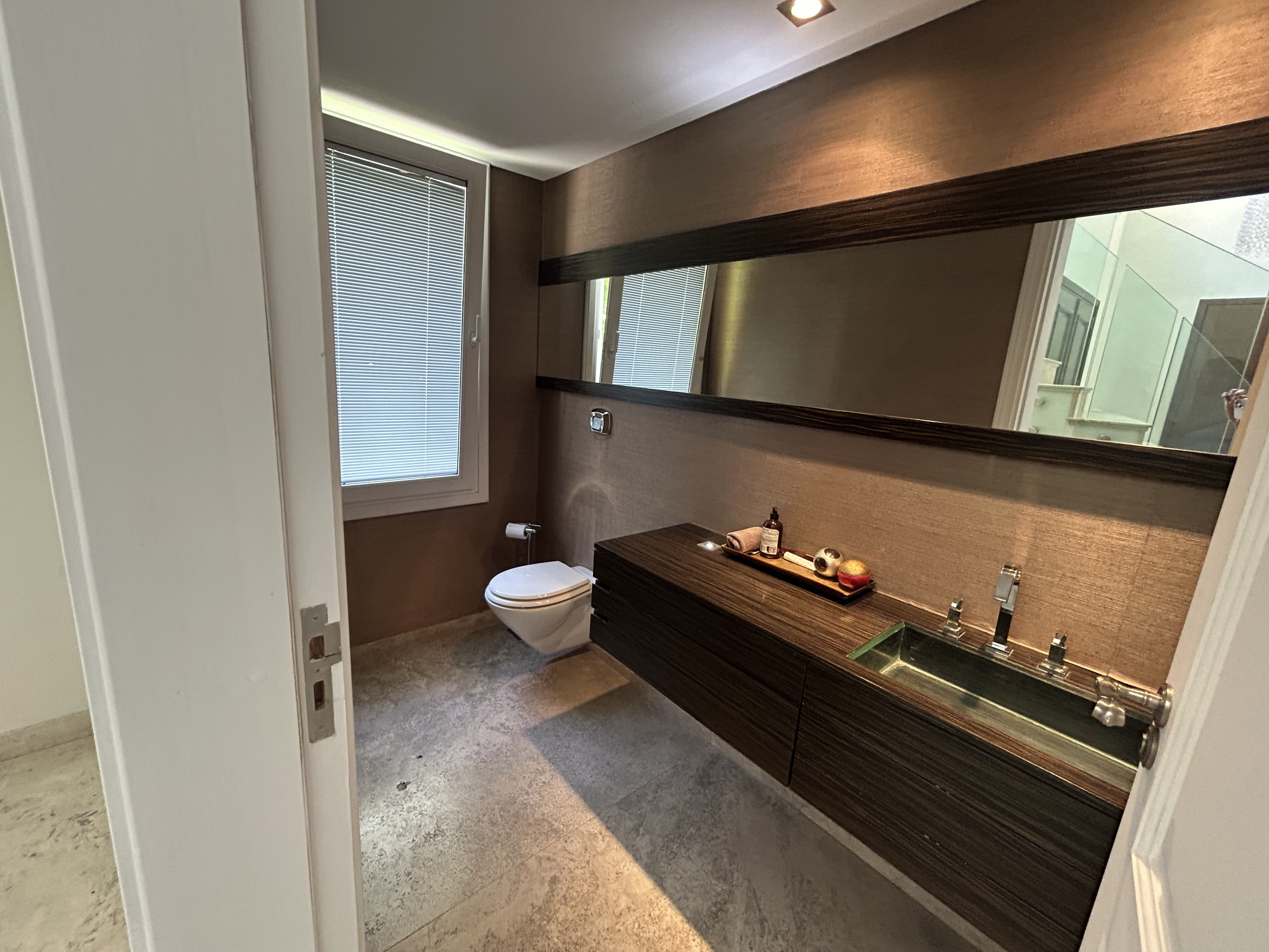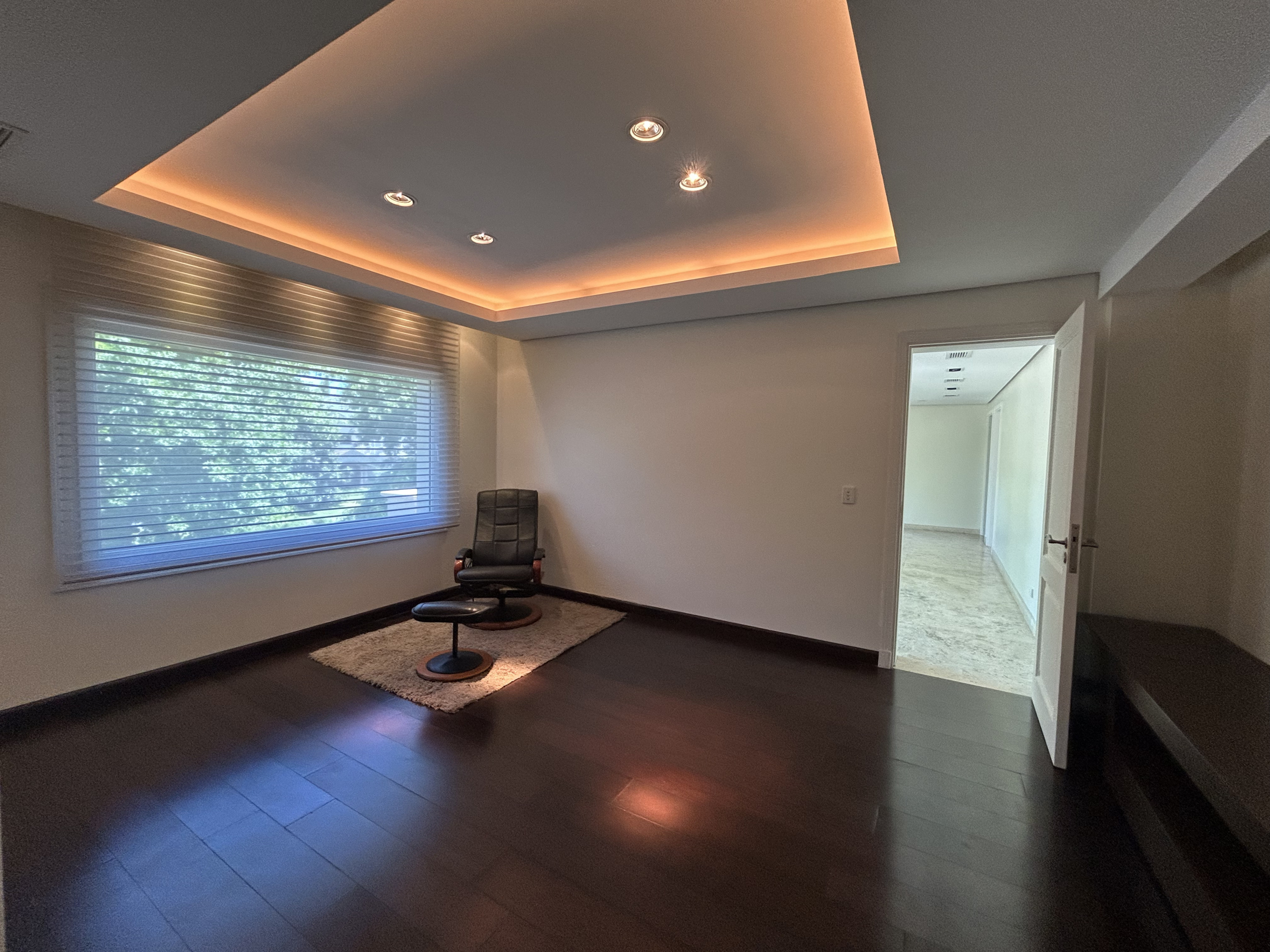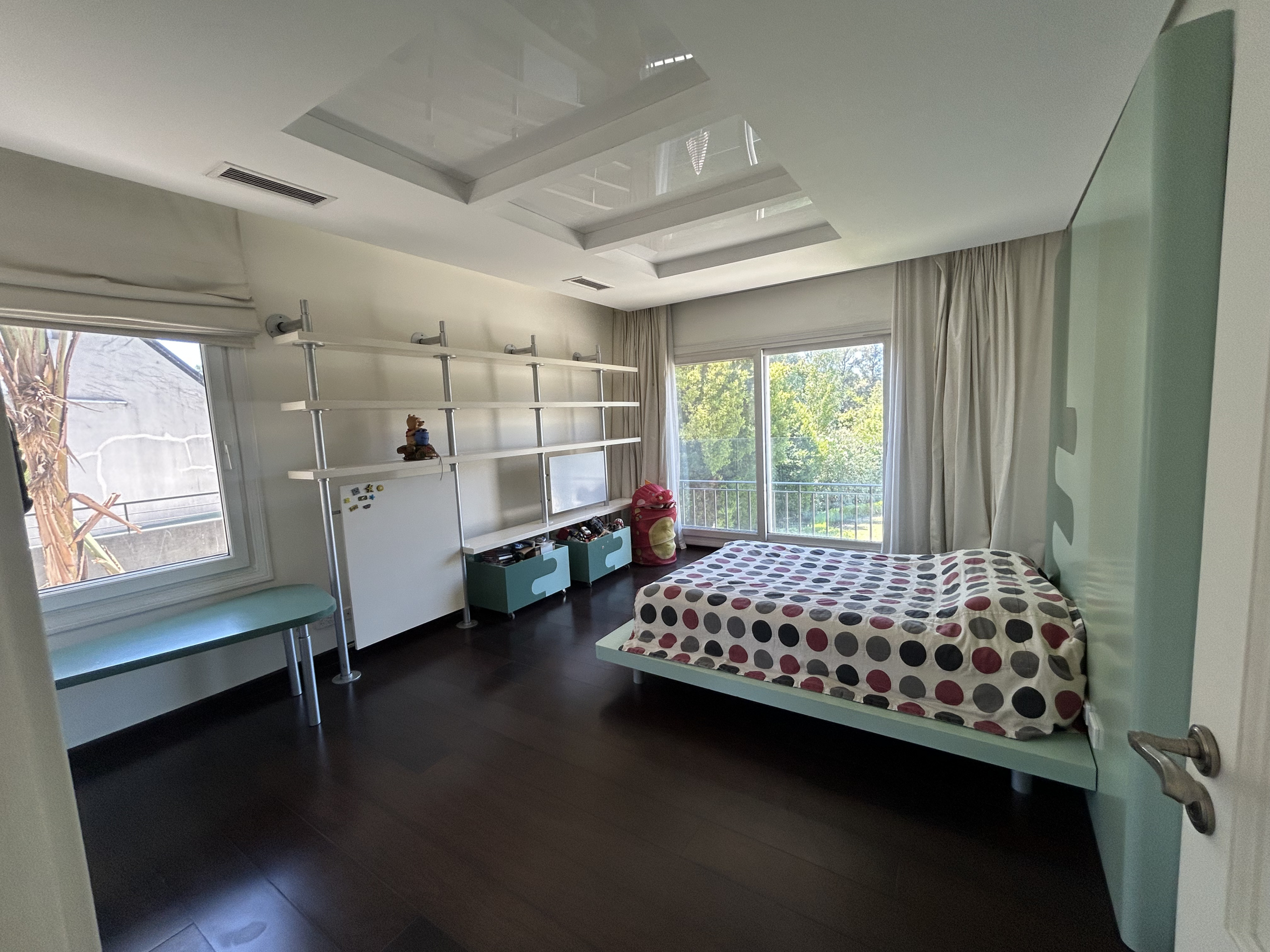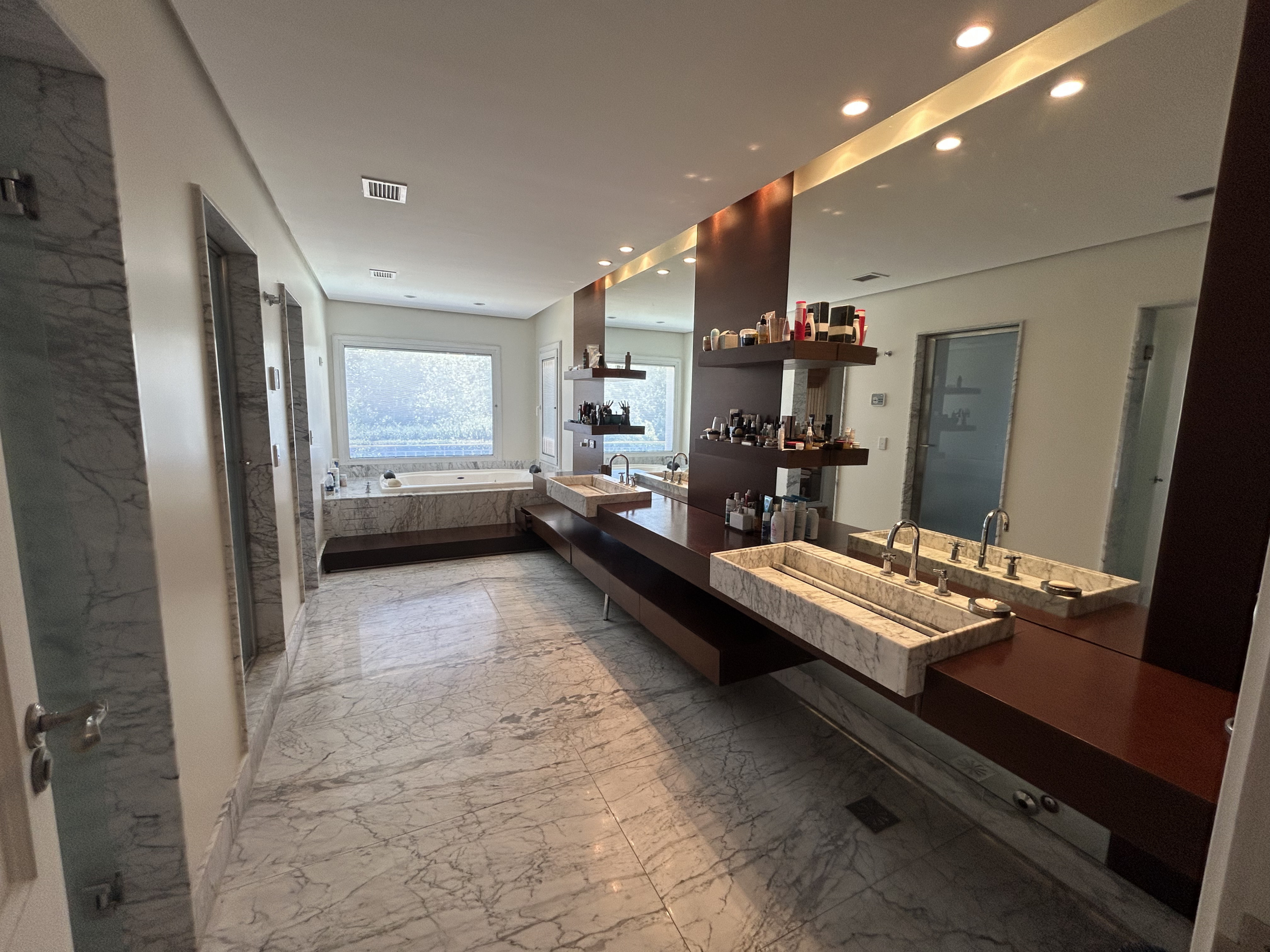 En la planta alta nos encontramos 2 habitaciones en suite, cada una con su propia terraza con vistas abiertas, luego se accede a través de una sala de lectura a dos enormes dormitorios que tienen en común un gran baño en suite y un doble vestidor de calidades excepcionales en madera. El baño posee jacuzzi, ducha escocesa, sauna seco y baño de vapor. En uno de los dormitorios se accede mediante una escalera a un gran altillo que puede ser utilizado para diversos fines.